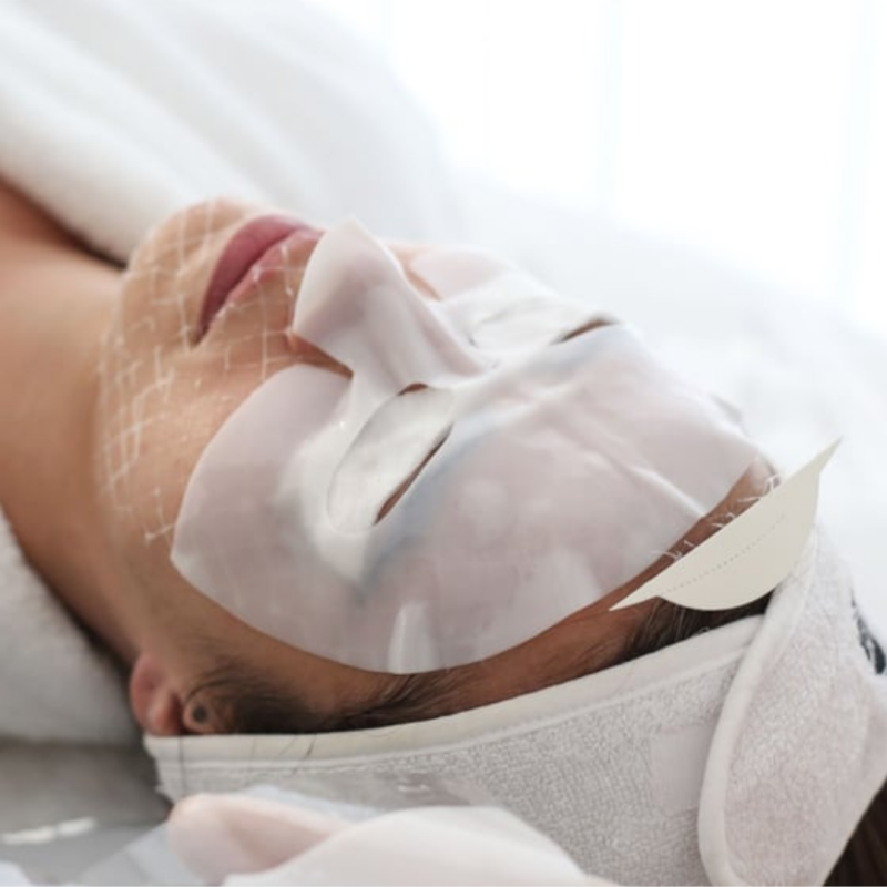 Verwijder voorzichtig de harde beschermlaag van het volledig collageendraden masker en leg het M.I.N.T.T. masker voorzichtig op het gezicht .